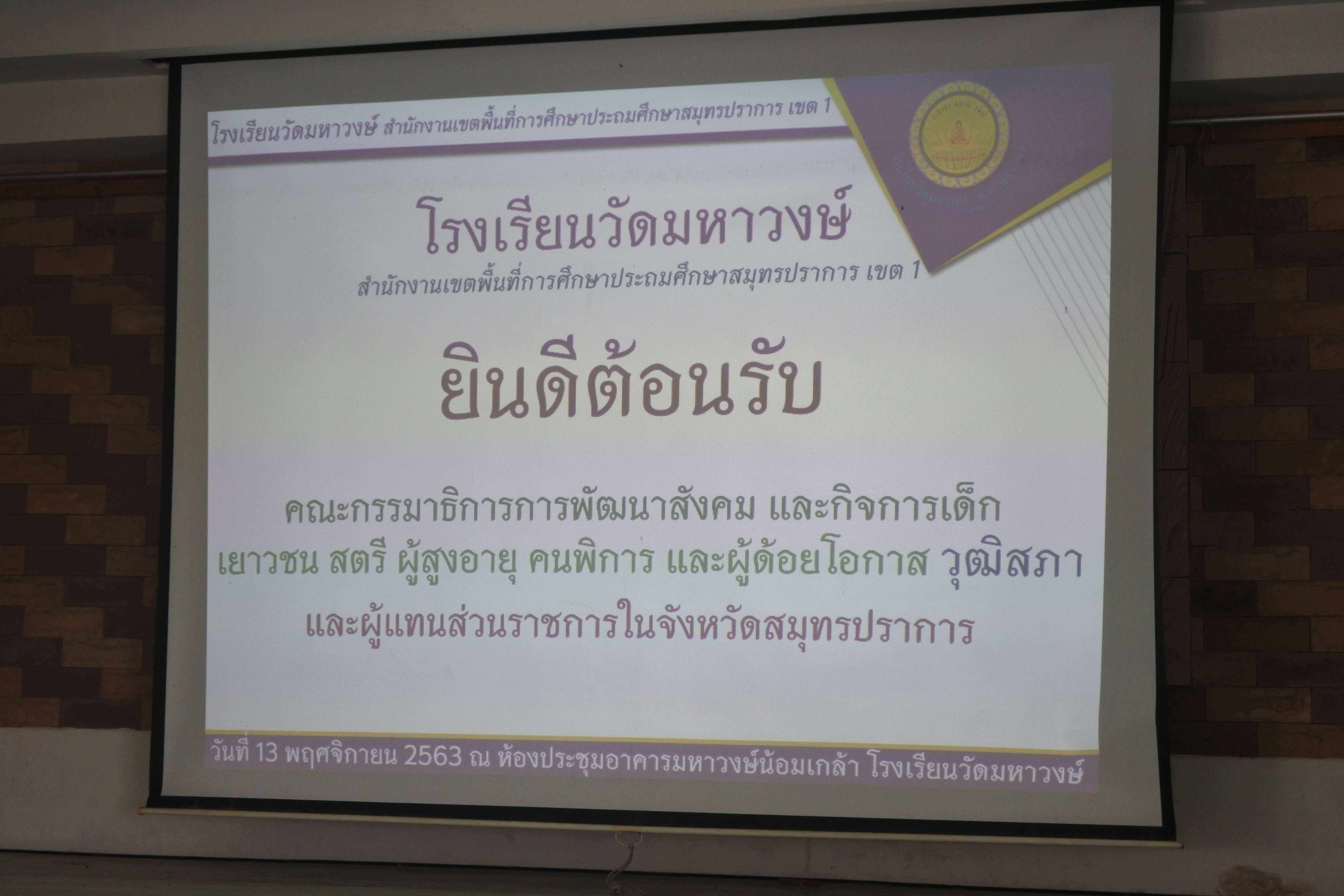 เมื่อวันที่ 13 พฤศจิกายน 2563 คณะกรรมาธิการการพัฒนาสังคม และกิจการเด็ก เยาวชน สตรี ผู้สูงอายุ คนพิการ และผู้ด้อยโอกาส วุฒิสภา นำโดย นายวัลลภ ตังคณานุรักษ์ ประธานคณะกรรมาธิการ พร้อมด้วยผู้แทนส่วนราชการในจังหวัดสมุทรปราการ ได้แก่ สำนักงานศึกษาธิการจังหวัดสมุทรปราการ สำนักงานเขตพื้นที่การศึกษาประถมศึกษาสมุทรปราการ เขต 1 สำนักงานสาธารณสุขจังหวัดสมุทรปราการ สำนักงานพัฒนาสังคมและความมั่นคงของมนุษย์จังหวัดสมุทรปราการ และสภาเด็กและเยาวชนจังหวัดสมุทรปราการ เข้าร่วมประชุมเพื่อติดตามการดำเนินงานดูแล คุ้มครองสิทธิและสวัสดิการของลูกแรงงานข้ามชาติ ตลอดจนปัญหาและอุปสรรคในการดำเนินงาน ณ ห้องประชุมอาคารมหาวงษ์น้อมเกล้าโรงเรียนวัดมหาวงษ์ โดยมี ดร.ชูขวัญ รัตนพิทักษ์ธาดา ผู้อำนวยการโรงเรียนวัดมหาวงษ์ และคณะครู ให้การต้อนรับ พร้อมทั้งรายงานข้อมูลที่เกี่ยวข้องต่อคณะกรรมาธิการและผู้แทนส่วนราชการ S:1