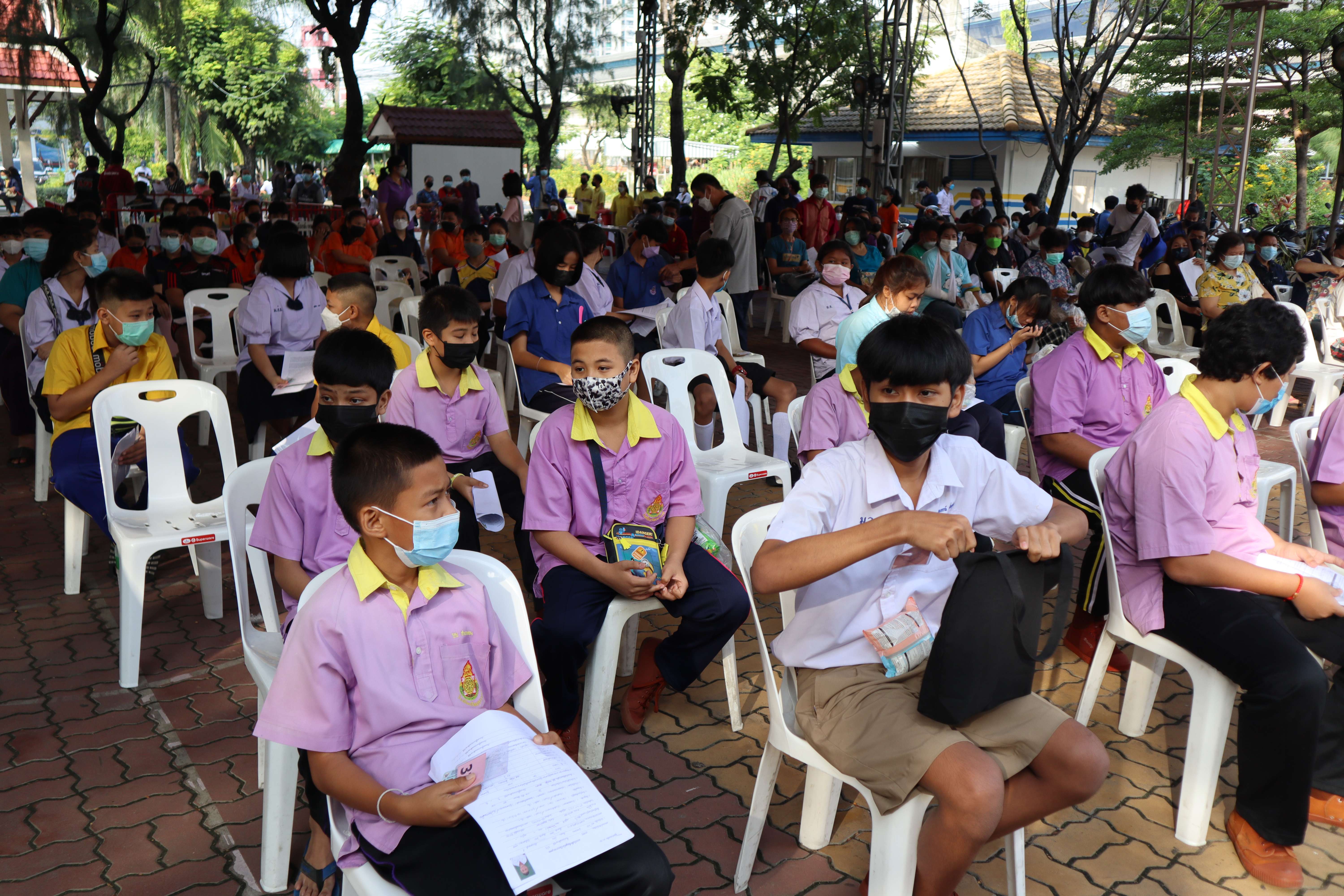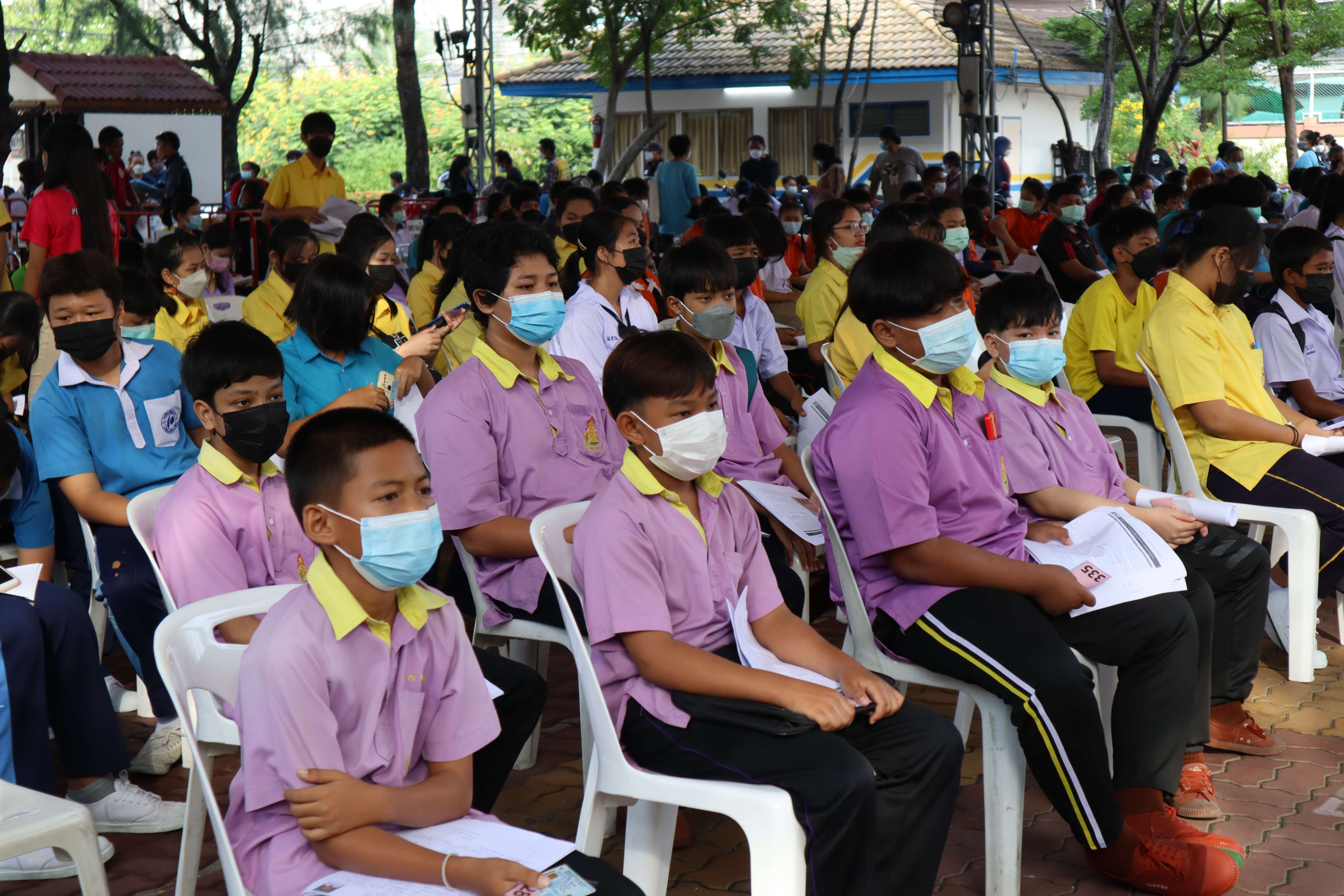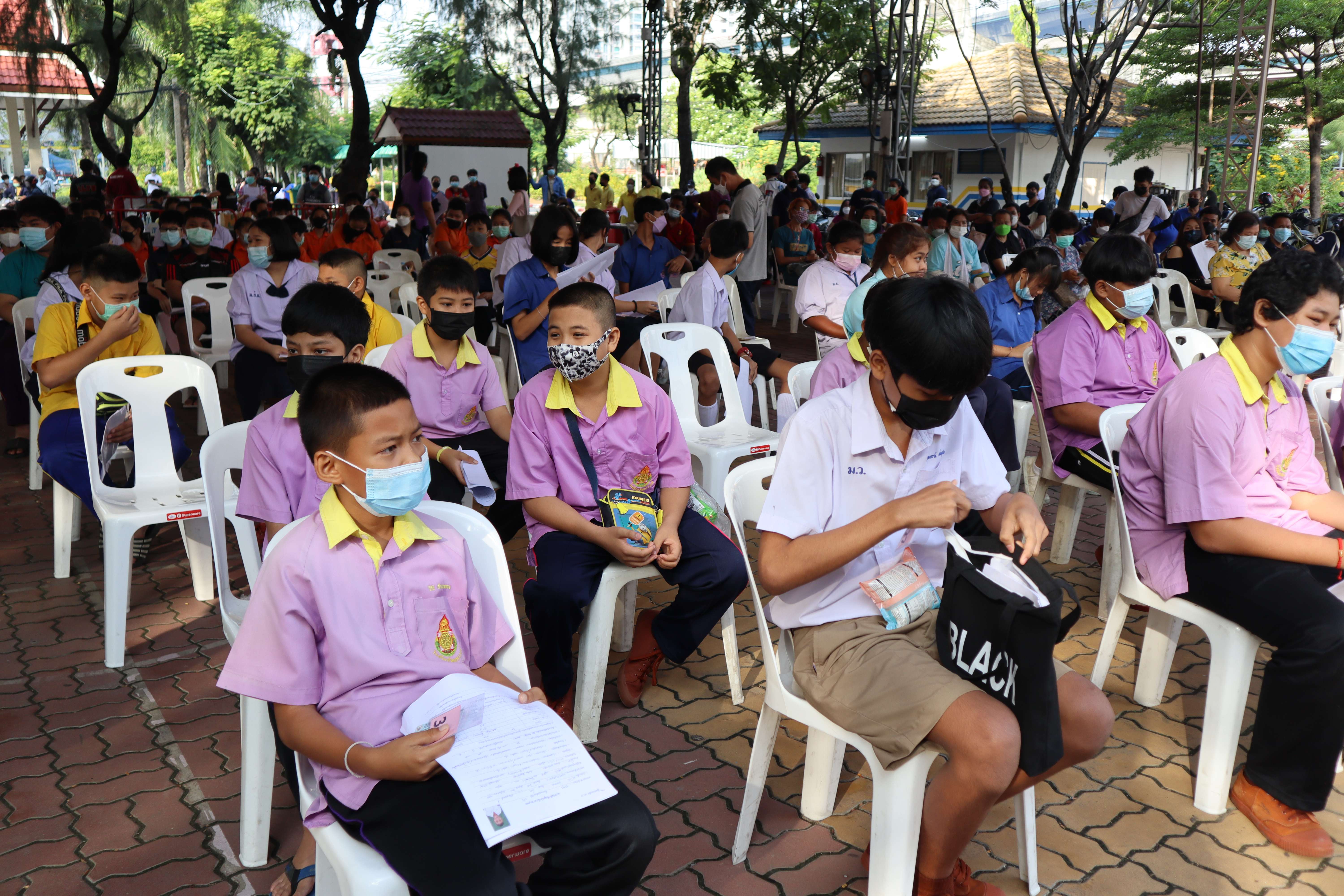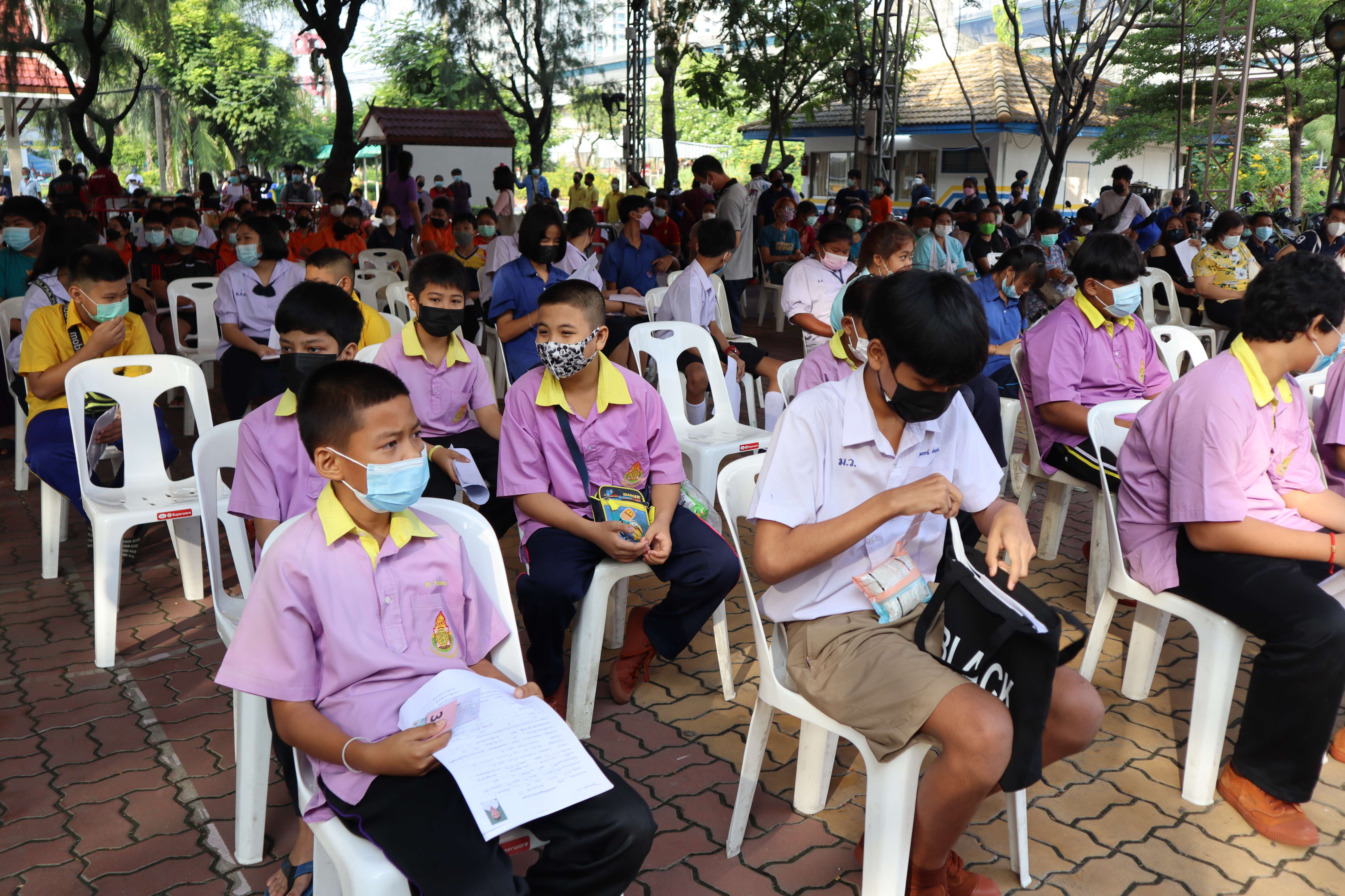 นักเรียนที่มีอายุครบ 12 ปีบริบูรณ์ เข้ารับการฉีดวัคซีนไฟเซอร์ (Pfizer) เข็มที่ 1