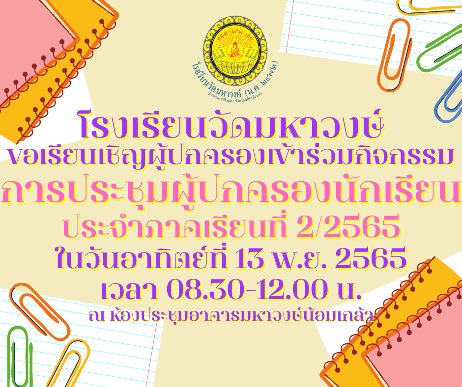 ขอเรียนเชิญเข้าร่วมกิจกรรมการประชุมผู้ปกครอง ภาคเรียนที่ 2 ปีการศึกษา 2565