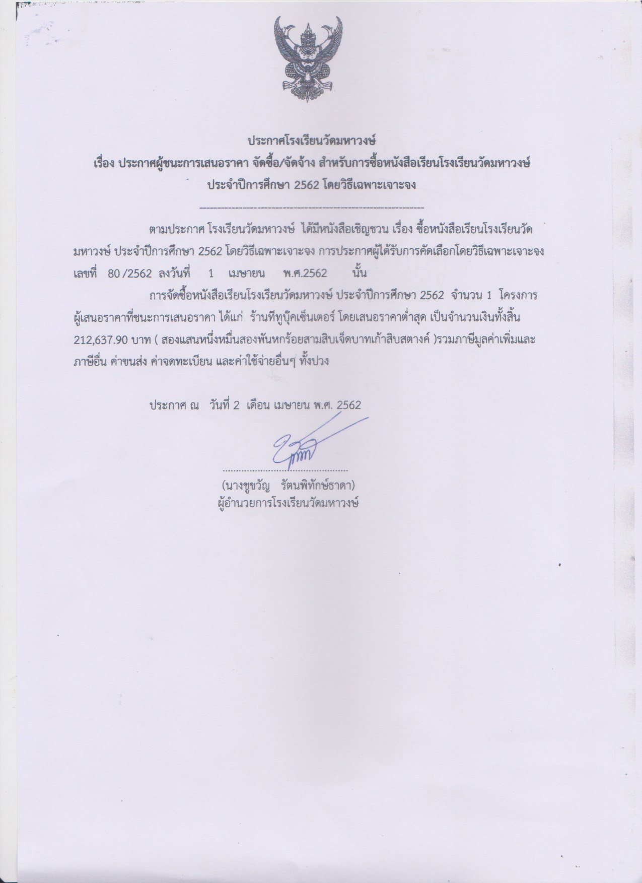 ประกาศผู้ชนะการเสนอราคา จัดซื้อ/จัดจ้าง สำหรับการซื้อหนังสือเรียนโรงเรียนวัดมหาวงษ์