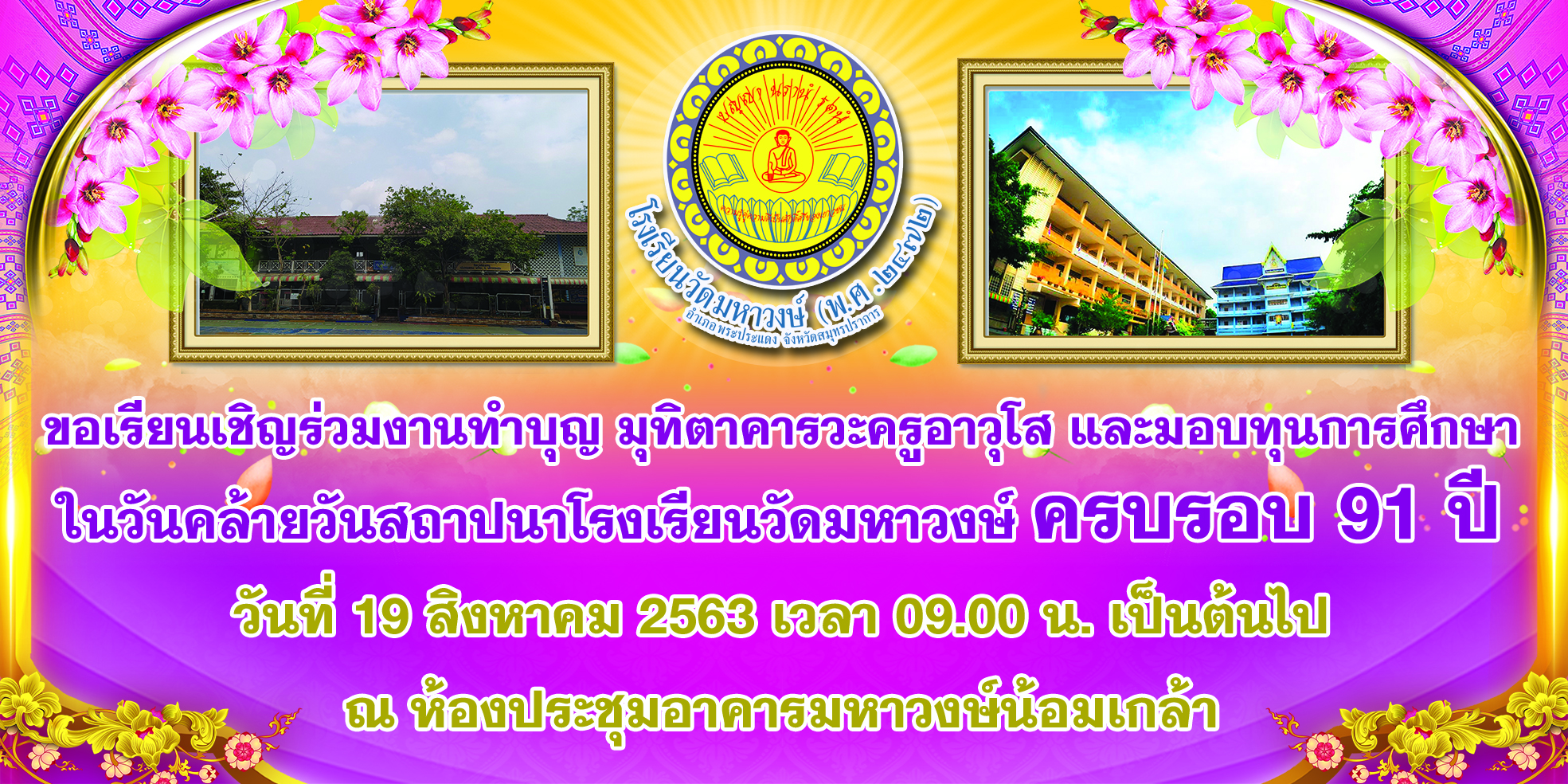 ขอเรียนเชิญร่วมทำบุญในวันคล้ายวันสถาปนาโรงเรียนวัดมหาวงษ์ ครบรอบ 91 ปี