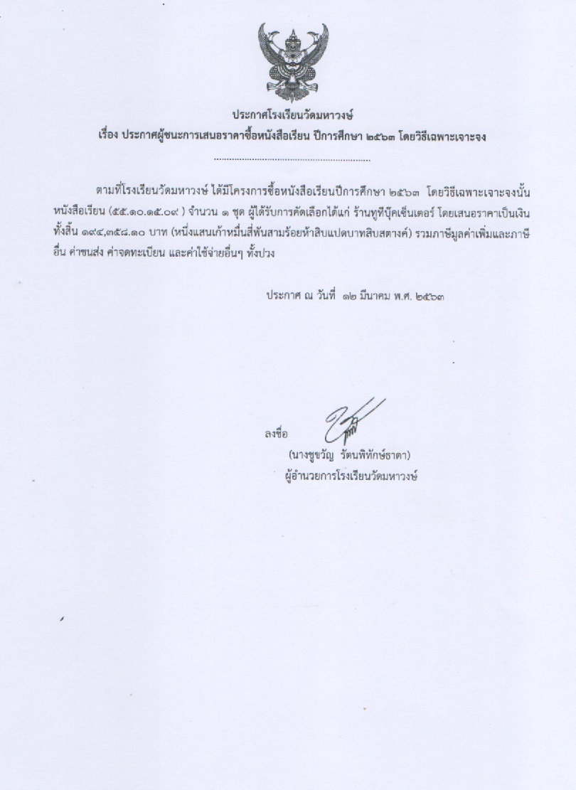 ประกาศผู้ชนะการเสนอราคา จัดซื้อ/จัดจ้าง สำหรับการซื้อหนังสือเรียนโรงเรียนวัดมหาวงษ์ ประจำปีการศึกษา 2563
