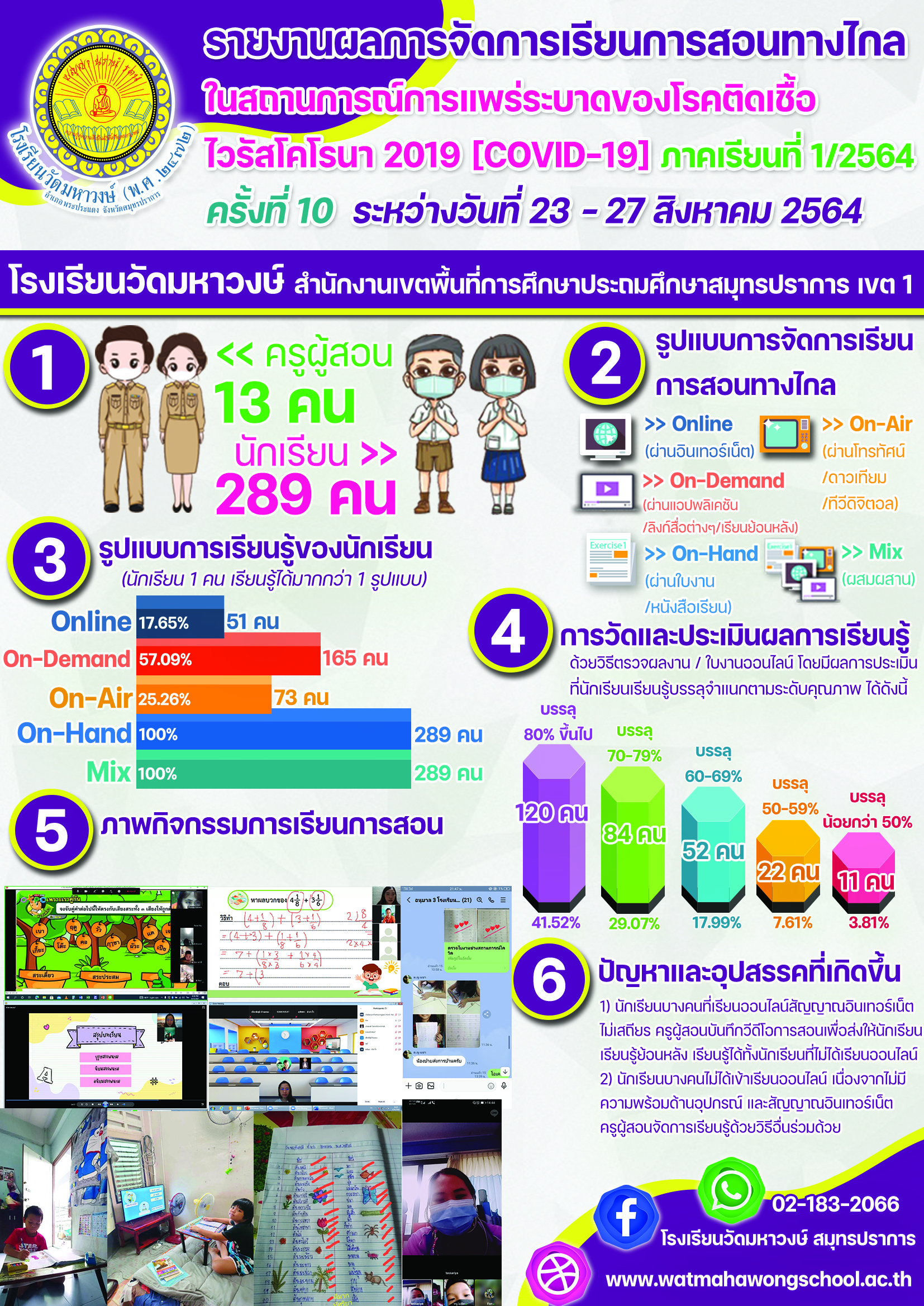 รายงานผลการจัดการเรียนการสอนทางไกลในสถานการณ์การแพร่ระบาดของโรคติดเชื้อไวรัสโคโรนา 2019 (COVID-19) ครั้งที่ 10 ระหว่างวันที่ 23-27 ส.ค. 2564