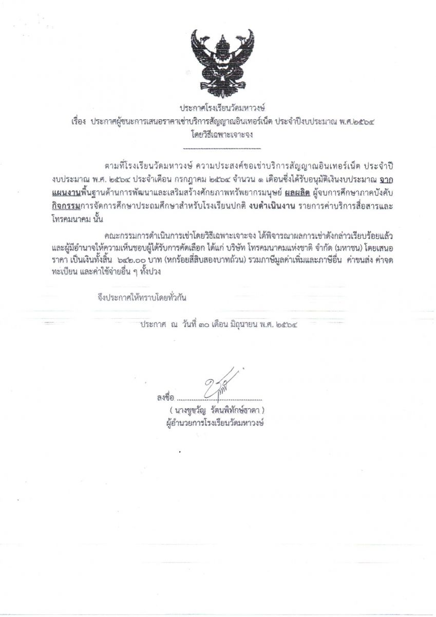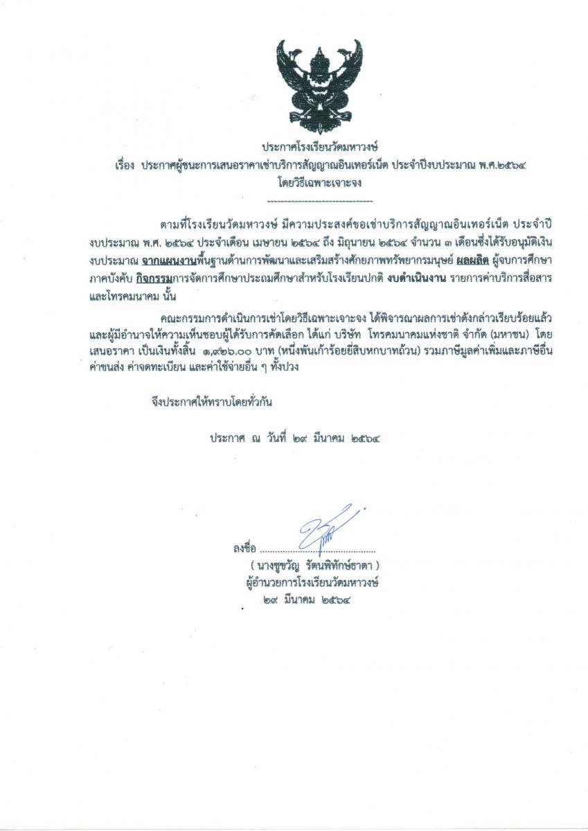 ประกาศผู้ชนะการเสนอราคาเช่าบริการสัญญาณอินเทอร์เน็ต ประจำปีงบประมาณ พ.ศ. 2564 โดยวิธีเฉพาะเจาะจง