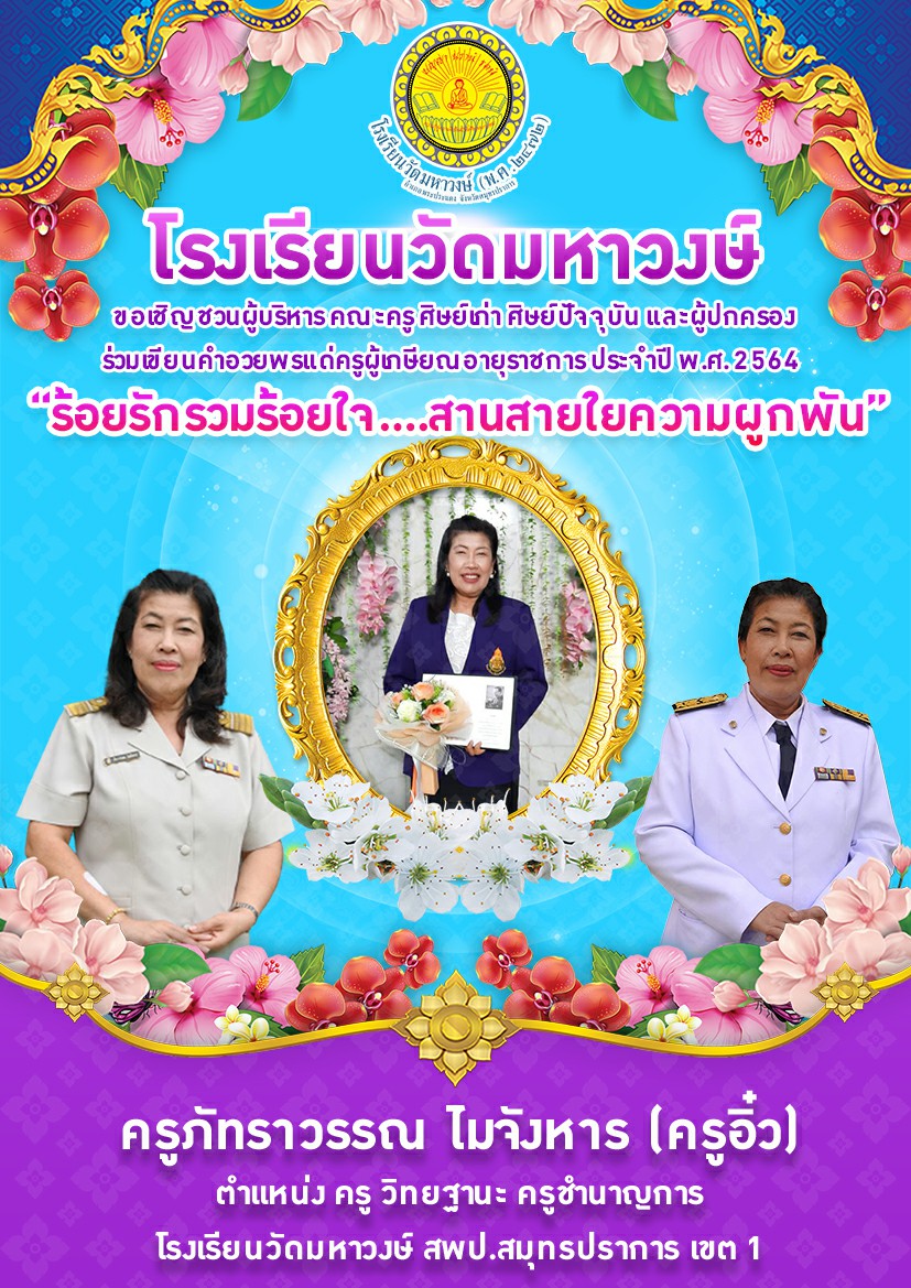 โรงเรียนวัดมหาวงษ์ ขอเชิญชวนผู้บริหาร คณะครู ศิษย์เก่า ศิษย์ปัจจุบัน และผู้ปกครอง ร่วมเขียนคำอวยพรแด่ครูผู้เกษียณอายุราชการ ประจำปี พ.ศ. 2564