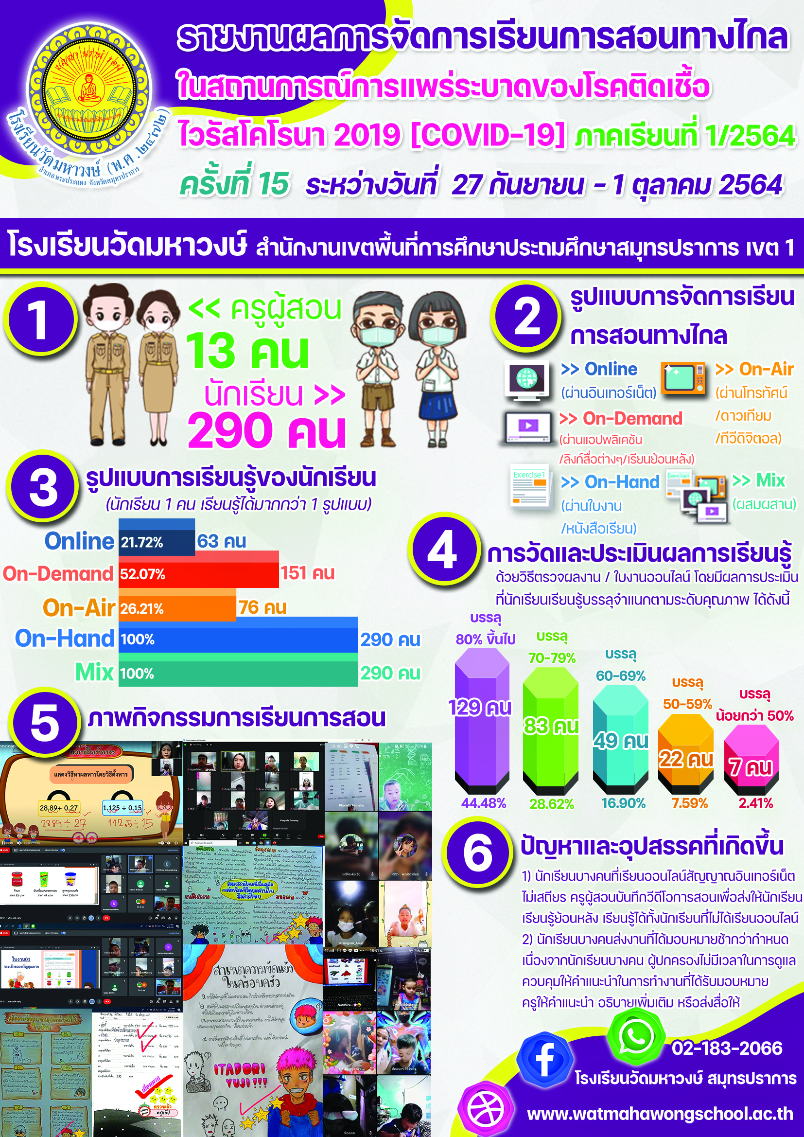รายงานผลการจัดการเรียนการสอนทางไกลในสถานการณ์การแพร่ระบาดของโรคติดเชื้อไวรัสโคโรนา 2019 (COVID-19) ครั้งที่ 15 ระหว่างวันที่ 27 ก.ย. - 1 ต.ค. 2564