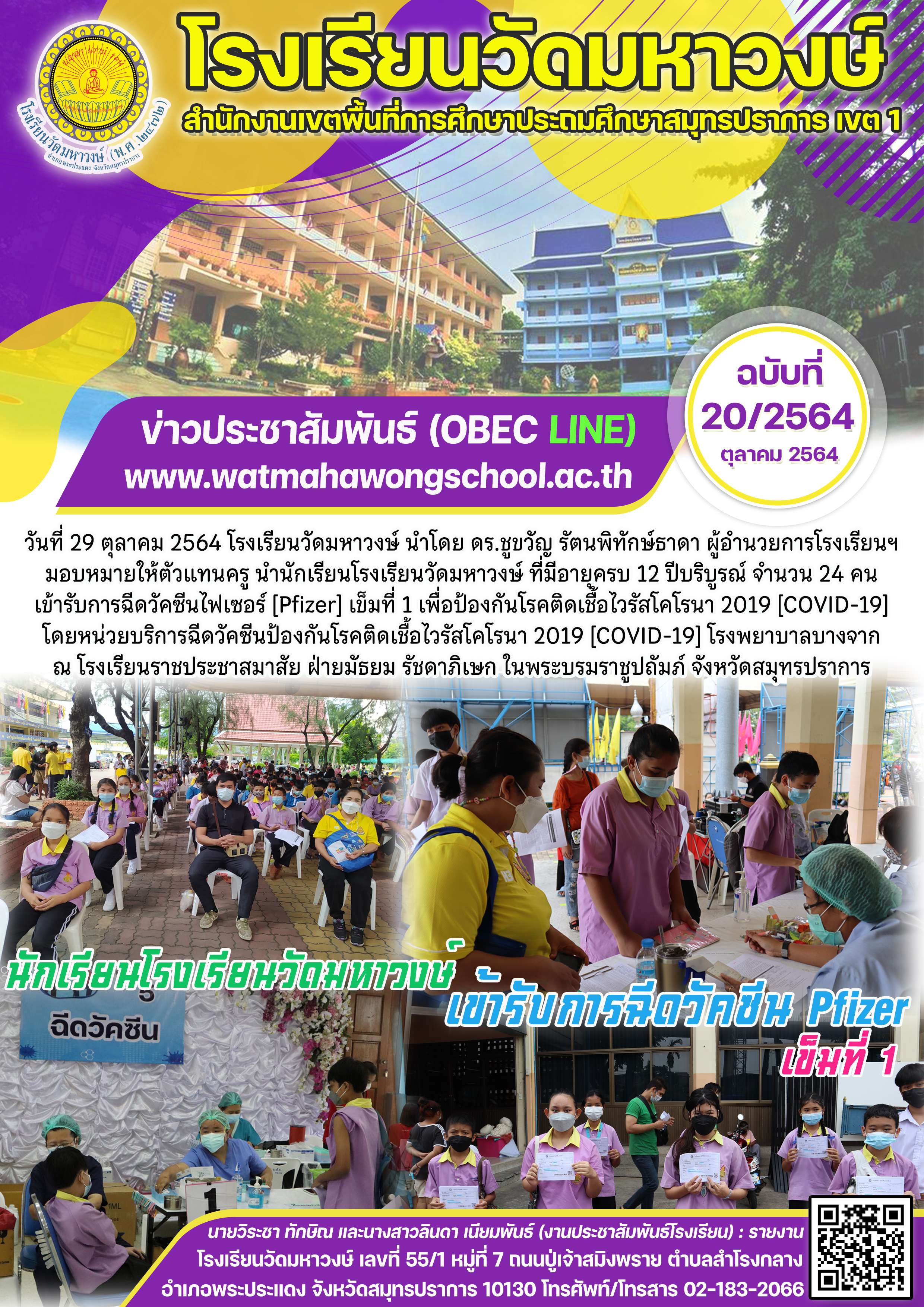 ฉบับที่ 20/2564 นักเรียนที่มีอายุครบ 12 ปีบริบูรณ์ เข้ารับการฉีดวัคซีนไฟเซอร์ (Pfizer) เข็มที่ 1