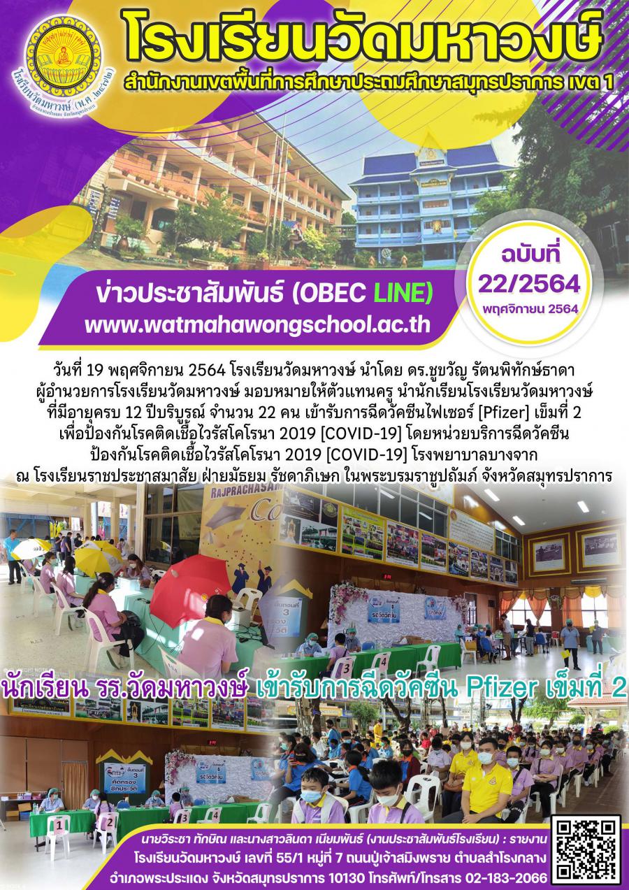 ฉบับที่ 22/2564 นักเรียนที่มีอายุครบ 12 ปีบริบูรณ์ เข้ารับการฉีดวัคซีนไฟเซอร์ (Pfizer) เข็มที่ 2