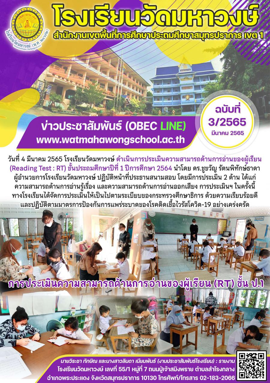 ฉบับที่ 3/2565 การประเมินความสามารถด้านการอ่านของผู้เรียน (RT) ชั้น ป.1