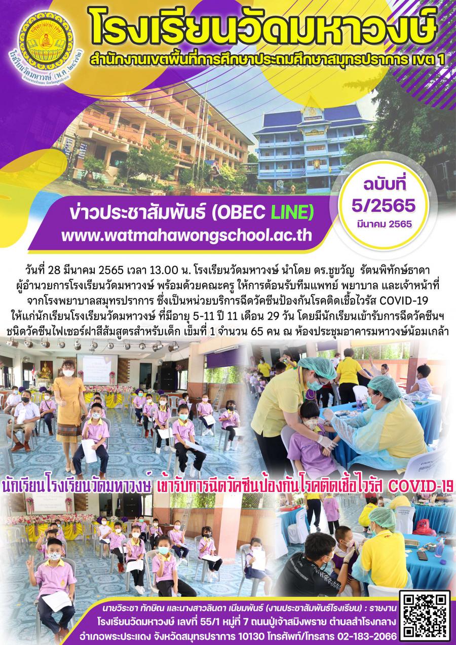 ฉบับที่ 5/2565 นักเรียนโรงเรียนวัดมหาวงษ์ เข้ารับการฉีดวัคซีนฯ เข็มที่ 1