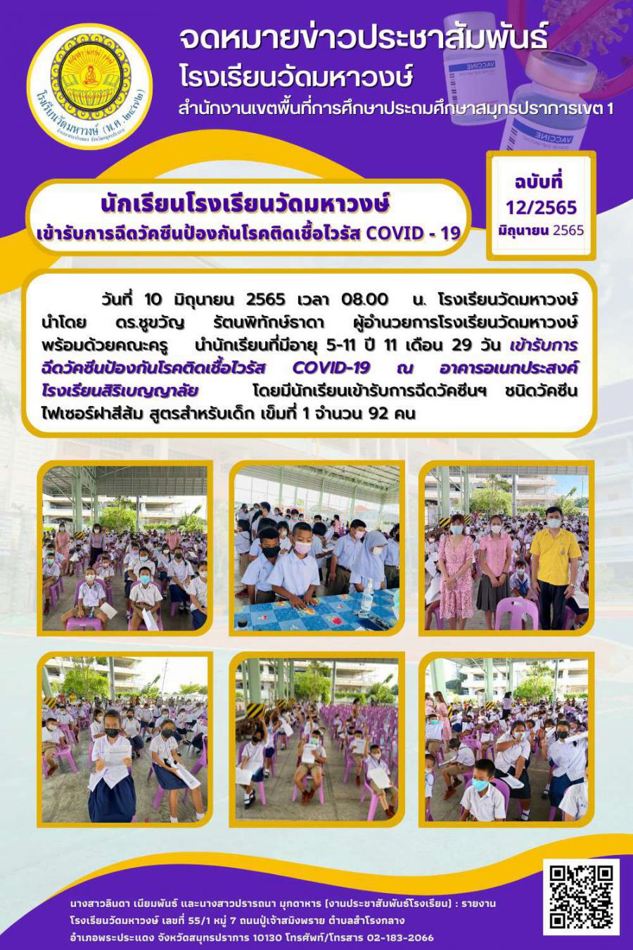 ฉบับที่ 12/2565 นักเรียนโรงเรียนวัดมหาวงษ์ เข้ารับการฉีดวัคซีนป้องกันโควิด-19 เข็มที่ 1
