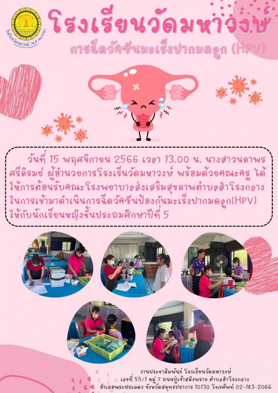 ฉบับที่ 23/2566 รพ.สต.สำโรงกลาง ฉีดวัคซีนป้องกันโรคมะเร็งปากมดลูก (HPV) ให้แก่นักเรียนหญิงที่มีอายุ 11 ปีขึ้นไป