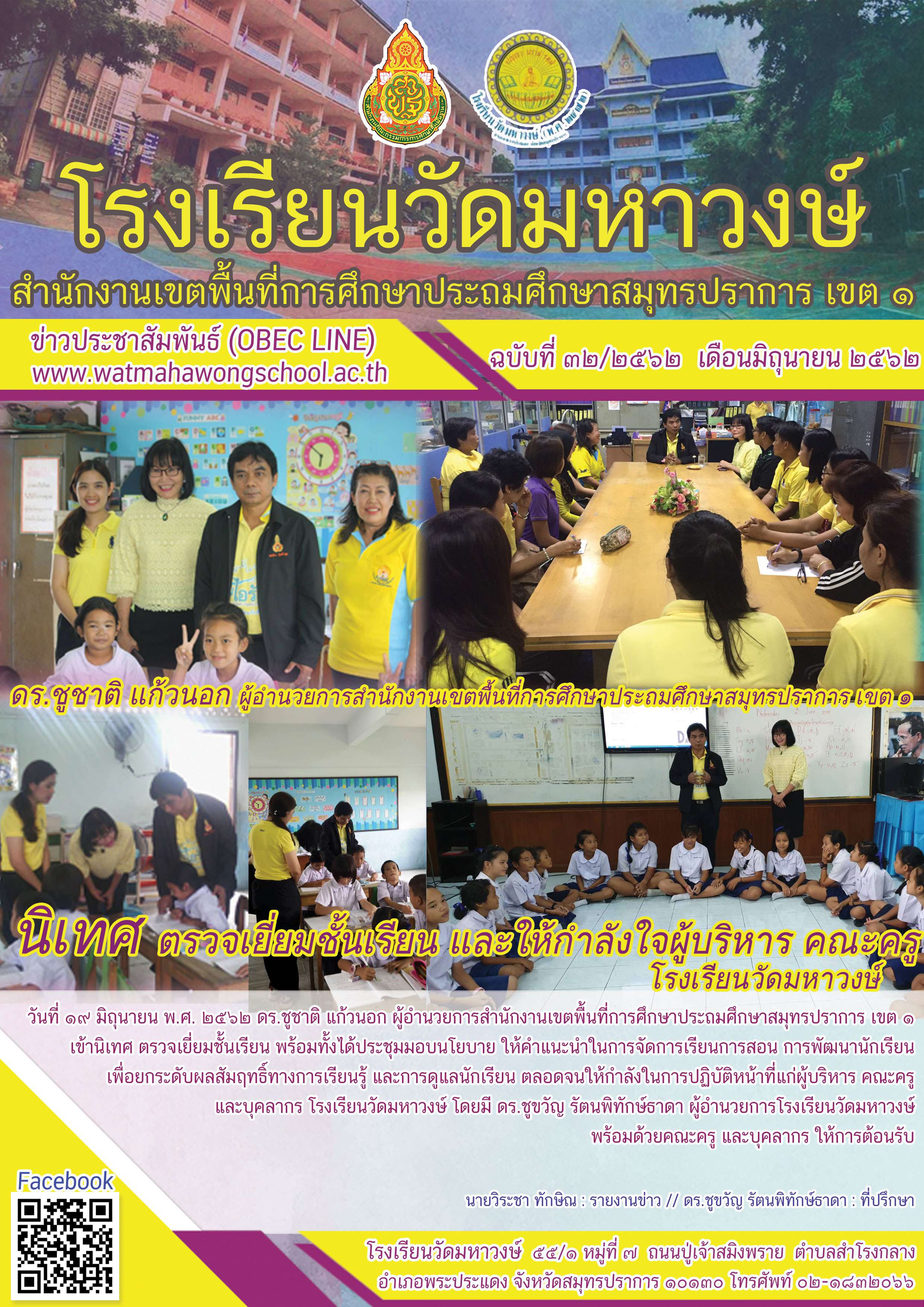 ฉบับที่ ๓๒/๒๕๖๒ ผอ.สพป.สมุทรปราการ เขต ๑ นิเทศ ตรวจเยี่ยมชั้นเรียน และให้กำลังใจผู้บริหาร และคณะครู ม.ว.