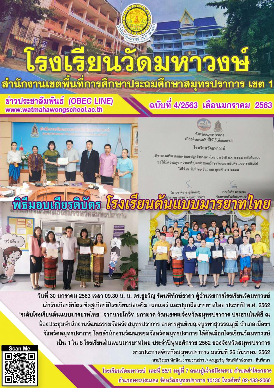 ฉบับที่ ๔/๒๕๖๓ พิธีมอบเกียรติบัตรเชิดชูเกียรติ โรงเรียนต้นแบบมารยาทไทย