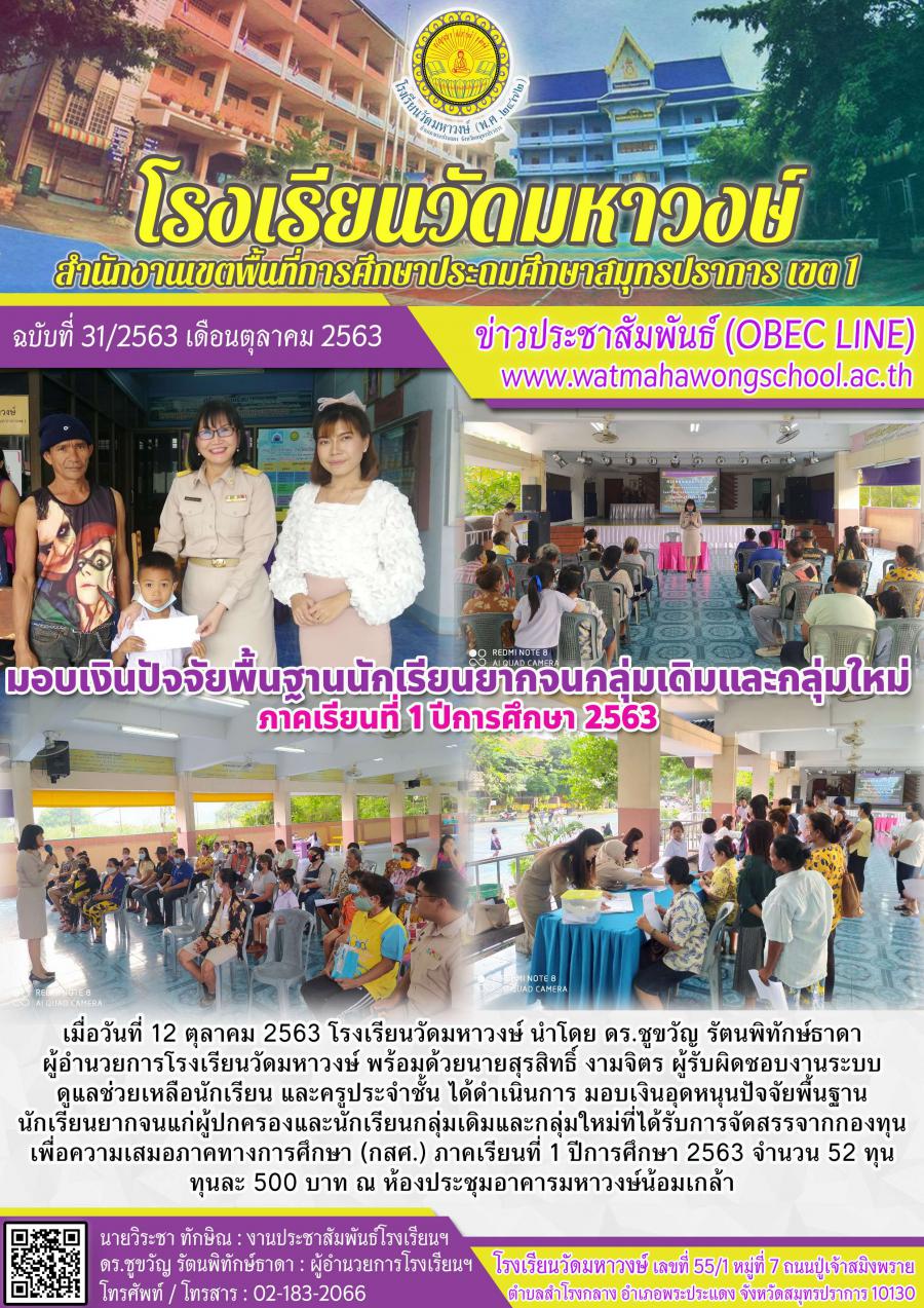 ฉบับที่ ๓๑/๒๕๖๓ มอบเงินปัจจัยพื้นฐานนักเรียนยากจนกลุ่มเดิมและกลุ่มใหม่ ภาคเรียนที่ ๑/๒๕๖๓