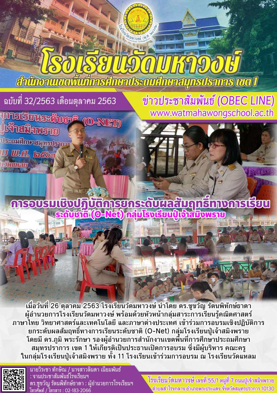 ฉบับที่ ๓๒/๒๕๖๓ การอบรมเชิงปฏิบัติการการยกระดับผลสัมฤทธิ์ทางการเรียนระดับชาติ (O-Net) กลุ่มโรงเรียนปู่เจ้าสมิงพราย