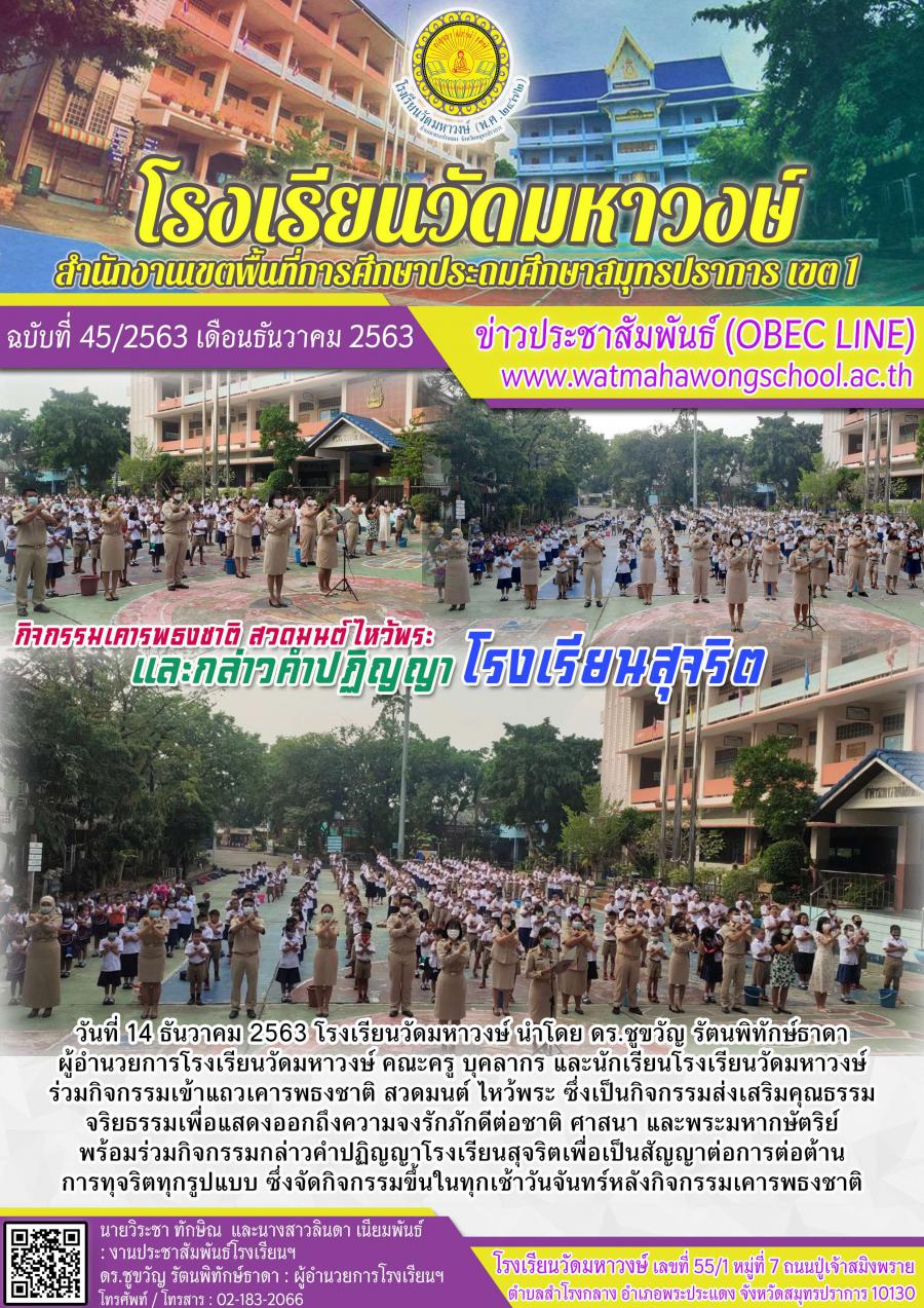 ฉบับที่ ๔๕/๒๕๖๓ กิจกรรมเคารพธงชาติ สวดมนต์ ไหว้พระ และกล่าวปฏิญญาโรงเรียนสุจริต