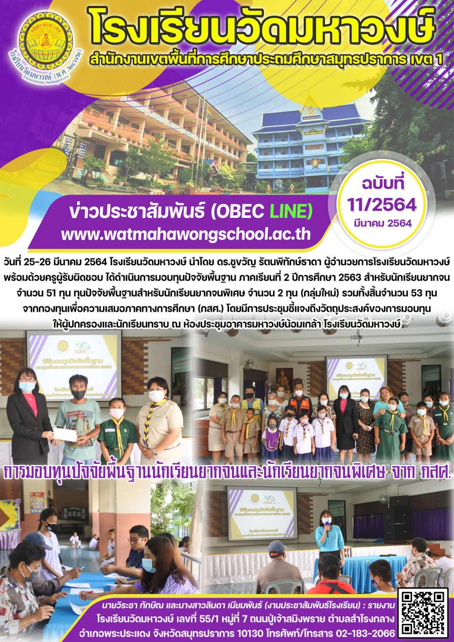 ฉบับที่ 11/2564 การมอบทุนปัจจัยพื้นฐานนักเรียนยากจน และนักเรียนยากจนพิเศษ ภาคเรียนที่ 2/2563